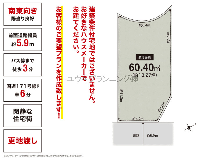| 特色 | バス通りに面す、建築条件なし、公共本下水、公営水道、都市ガス。 | ||