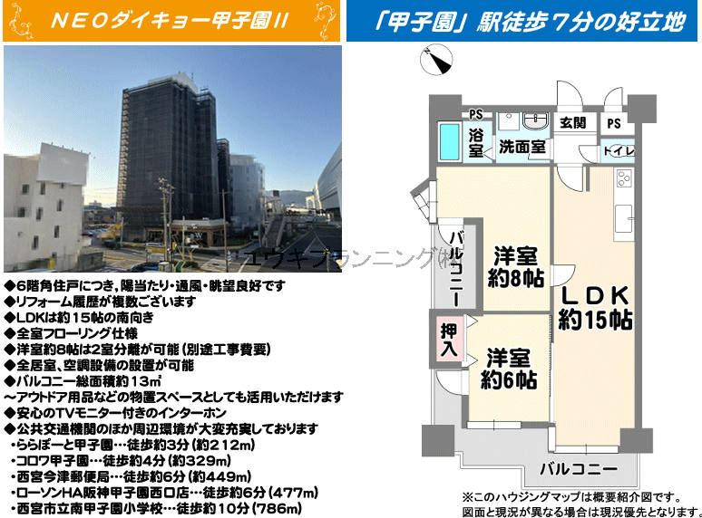 | 特色 | 【NEOダイキョー甲子園Ⅱ】 南甲子園小学校・鳴尾中学校区、リフォーム歴有、角部屋、通風良好、日当たり良好、眺望良好、徒歩圏内に甲子園球場、スーパー有、ららぽーと甲子園まで歩5分、最寄駅まで徒歩10分以内です。 | ||