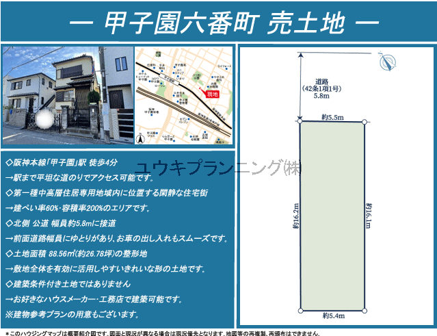 | 特色 | 【甲子園六番町土地】鳴尾北小学校、鳴尾中学校、整形地、建築条件なし、最寄駅まで徒歩4分、生活至便、甲子園六番町はめったに出ない土地です。 | ||
