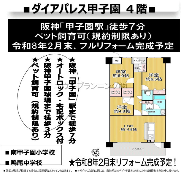 | 特色 | 【ダイヤパレス甲子園】南甲子園小学校、鳴尾中学校、2月リフォーム完成予定、日当たり良好、通風良好、最寄駅まで徒歩10分以内、徒歩圏内にスーパー有、オートロック、ペット飼育可。 | ||