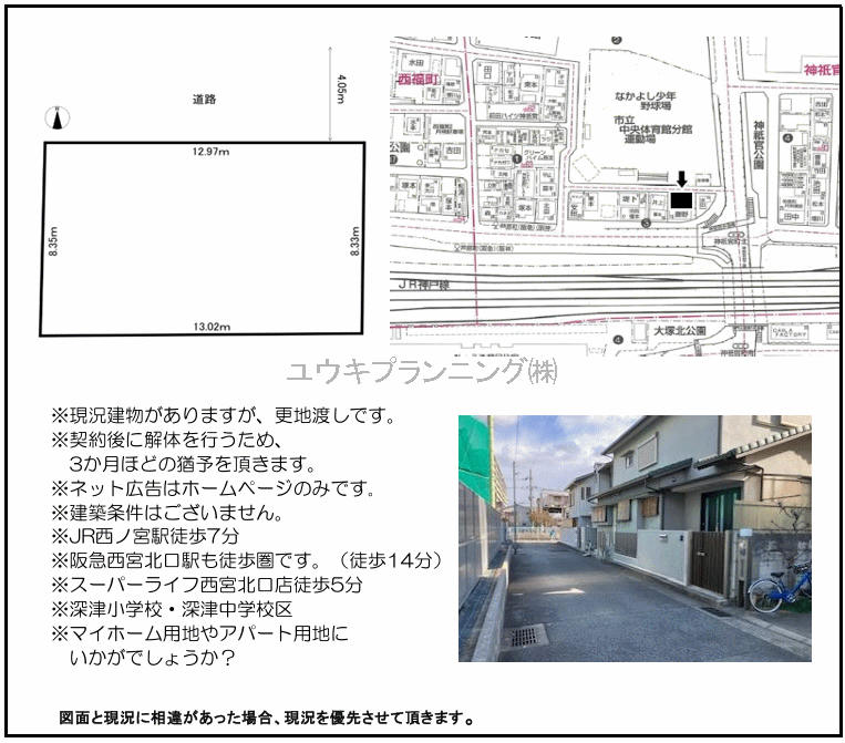 | 特色 | 最寄駅まで徒歩7分、閑静な住宅街、更地渡し、建築条件なし、整形地。 | ||