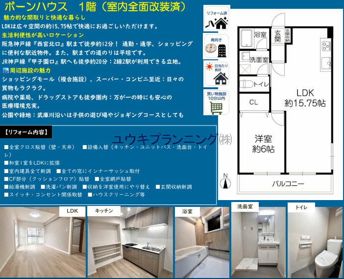 | 特色 | 【ボーンハウス】瓦林小学校、瓦木中学校、リフォーム済、南向き、日当たり良好、生活至便の立地、2駅利用、西宮ガーデンズ約徒歩11分、最寄駅まで徒歩10分以内。 |