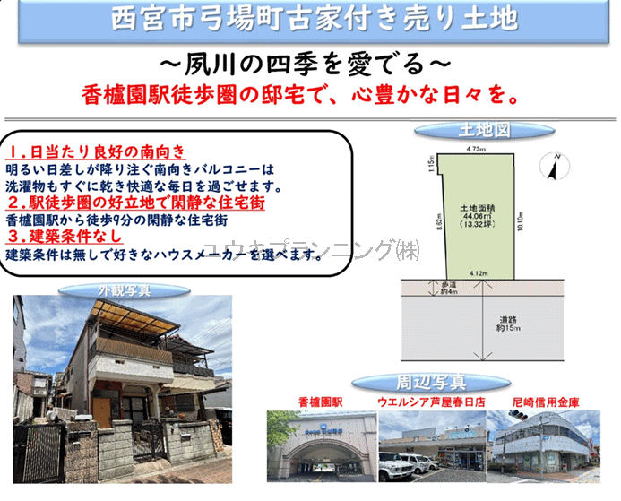 【弓場町土地】香枦園小学校、浜脇中学校、最寄駅まで徒歩9分、南向き、日当たり良好、整形地、都市ガス、公共本下水、公営水道、建築条件無。 |