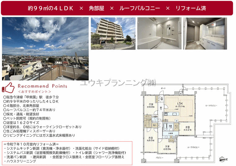 【ネバーランド甲東園T番館】段上西小学校、甲陵中学校、北東角部屋、リフォーム済、日当たり良好、通風良好、眺望良好。 |