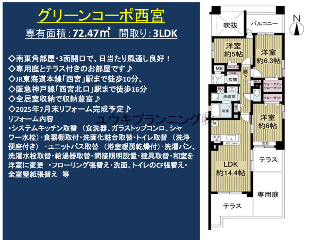 【グリーンコーポ西宮】 安井小学校・大社中学校区、リフォーム済、東南角部屋、オートロック、2面バルコニー、3WAY,最寄駅まで徒歩10分以内、日当たり良好、通風良好、平成10年建築、南向き、阪急西宮北口駅徒歩16分です。 |