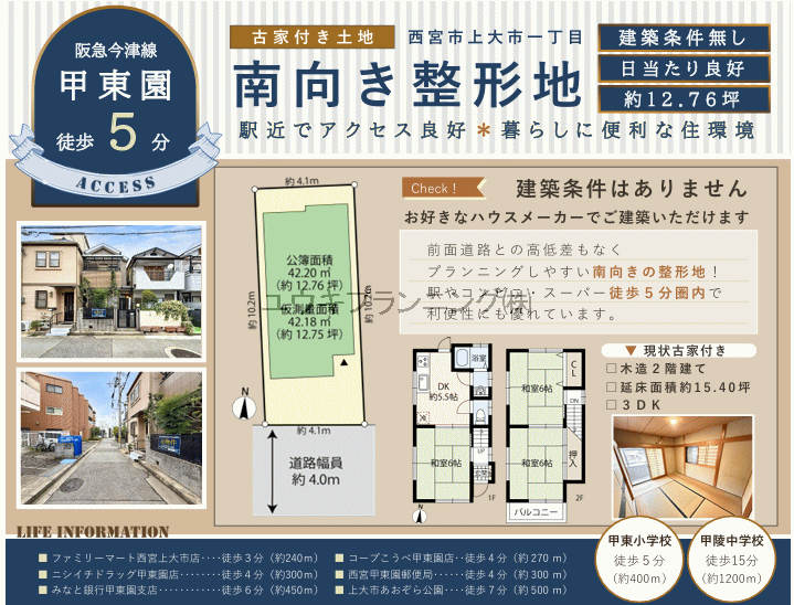 【上大市1丁目土地】甲東小学校、甲陵中学校、駅近、建築条件無、整形地、南向き、日当たり良好、平坦地です。 |