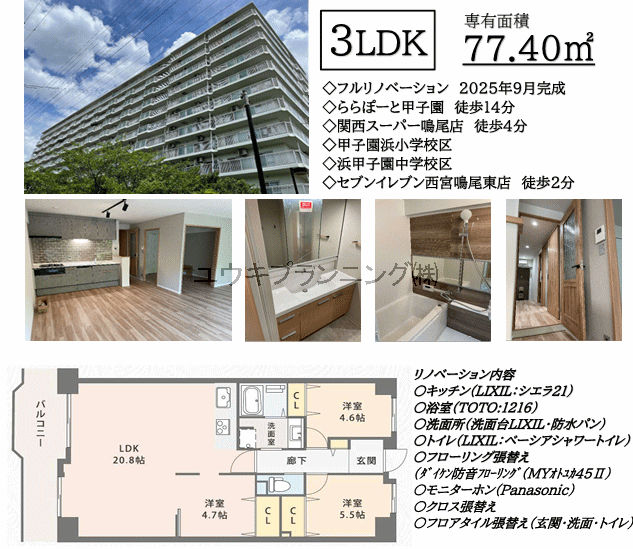 【サンロイヤル武庫川サンク】甲子園浜小学校、浜甲子園中学校、リフォーム済、日当たり良好、通風良好、徒歩圏内に関西スーパー有、前は上田西公園です。 |