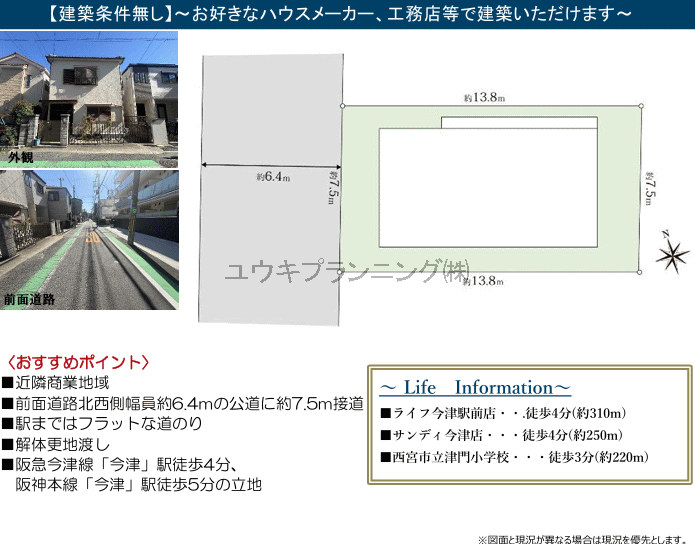 閑静な住宅街、建築条件なし、最寄駅まで徒歩10分以内、整形地、更地渡し。 |