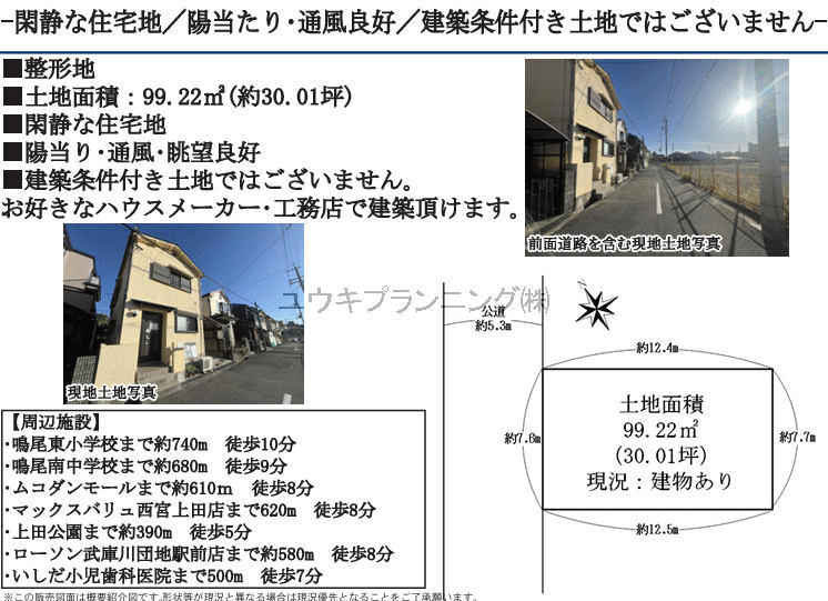 【上田東町土地】鳴尾東小学校、鳴尾南中学校、駅歩2分、間口お広い土地、建築条件なし、最寄駅まで徒歩10分以内、閑静な住宅街、更地渡し、日当たり良好です。 |