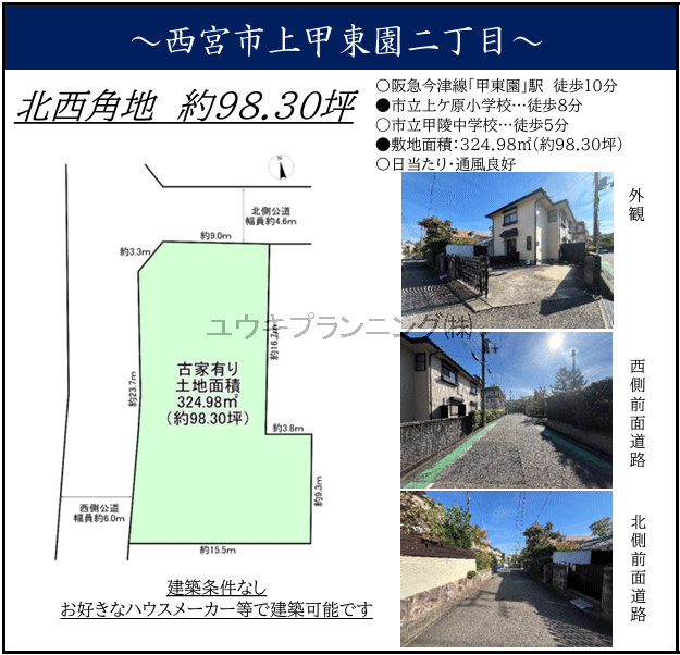 【上甲東園2丁目土地】上ヶ原小学校、甲陵中学校、角地、建築条件なし、公営水道、公共本下水、都市ガス、閑静な住宅街。 |