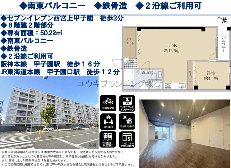 【甲子園第8コーポラスA棟】春風小学校、上甲子園中学校、日当たり良好、ペット飼育可、通風良好、コーヨーまで徒歩5分、コンビニまで徒歩6分。 |