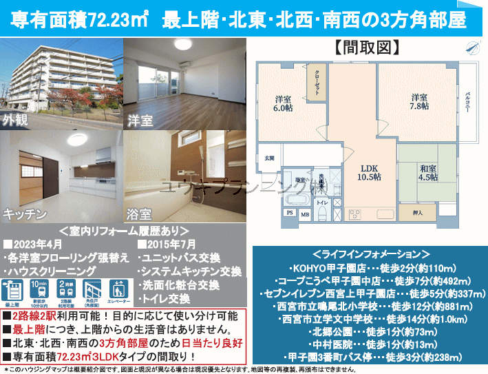 【コープ甲子園】鳴尾北小学校、学文中学校、リフォーム歴有、3方角部屋、日当たり良好、レストラン神戸屋さん目の前です。 |