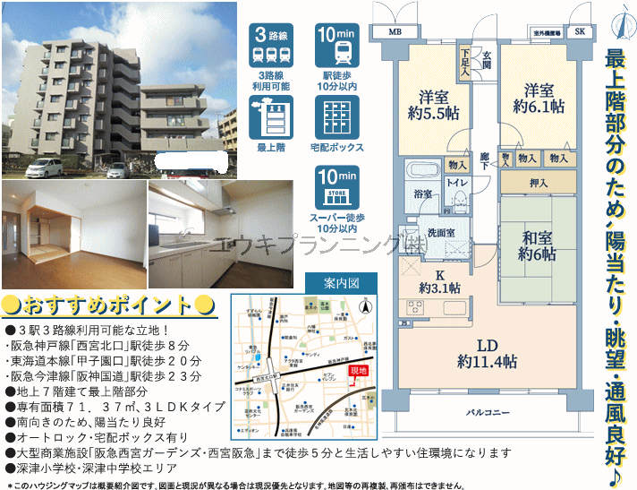 最上階、眺望良好、浴室換気乾燥機能付き、エレベータ、宅配ボックス、オートロック、南向き、日当たり良好、通風良好、最寄駅まで徒歩10分以内、西宮ガーデンズ徒歩約3分、生活至便です。 |