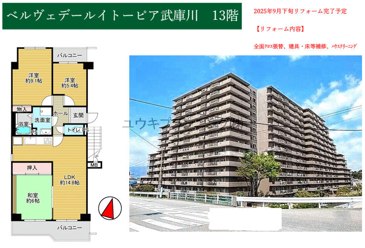 【イトーピア武庫川】小松小学校、学文中学校、リフォーム済、駐車場有、南向き、眺望良好、2面バルコニー、日当たり良好、武庫川もすぐ。