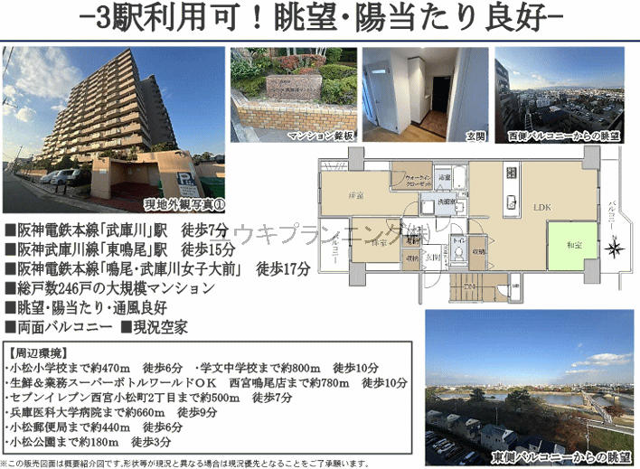 【イトーピア武庫川】小松小学校、学文中学校、駐車場有、眺望良好、2面バルコニー、日当たり良好、武庫川もすぐ。