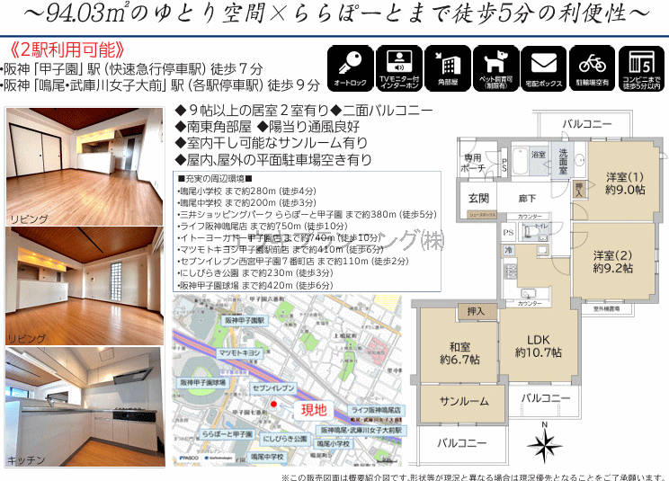 角部屋、日当たり良好、駐車場有、最寄駅まで徒歩10分以内、ららポート、甲子園球場あり。 |