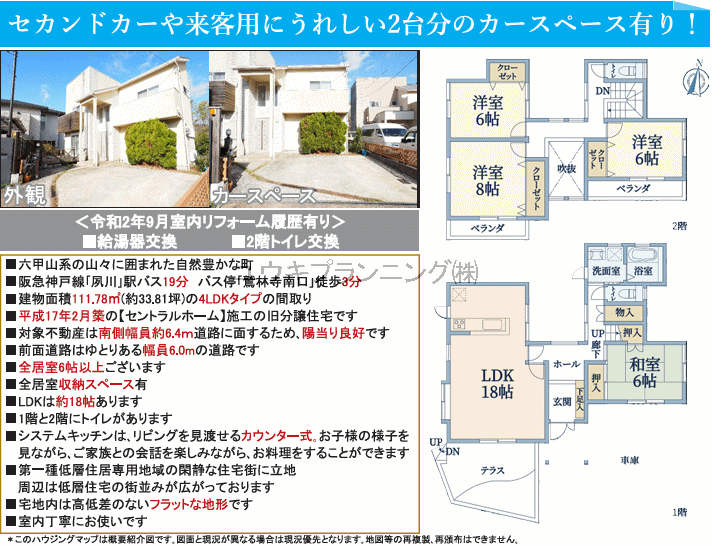 【鷲林寺南町中古戸建】苦楽園小学校、苦楽園中学校、駐車スペース車2台可、閑静な住宅街、日当たり良好、緑豊かな住宅街です。 |
