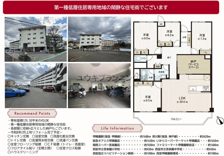 | 特色 | 【夙川台サンハイツD棟】苦楽園小学校、苦楽園中学校、2月リフォーム完成予定、静かな住宅街、南西向き、駐車場有、日当り良好、通風良好。 | |||||||||||||||||