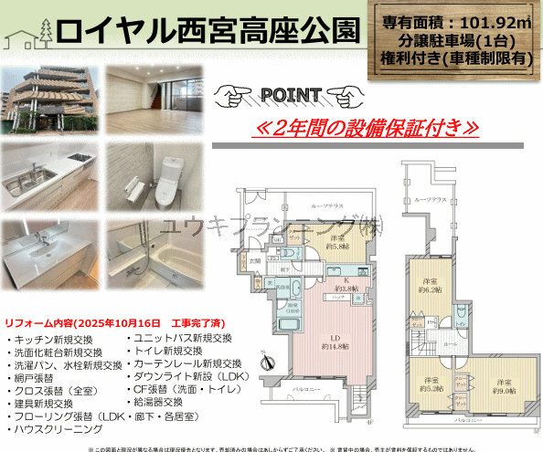 【ロイヤル西宮高座公園】 広田小学校・平木中学校区、リフォーム済、メゾネットタイプ、駐車場有、ペット飼育可、エレベータ、オートロック、当たり良好、閑静な住宅街です。 |