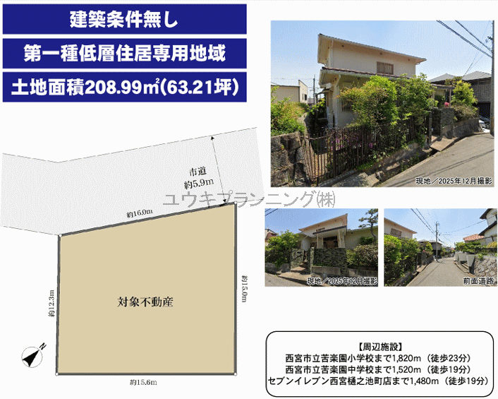 【苦楽園六番町土地】苦楽園小学校、苦楽園中学校、前面道路幅5.9m、日当たり良好、整形地、閑静な住宅街、建築条件なし。 |