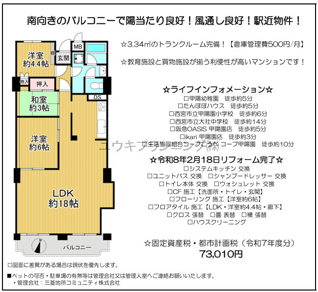 【グランドハイツ甲陽園】 甲陽園小学校・大社中学校区、2月リフォーム完成予定、エレベータ、日当たり良好、通風良好、総戸数50戸以上、最寄駅まで徒歩10分以内、徒歩圏内にスーパ有。 |