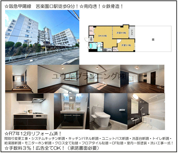 【夙川第3コーポラス】北夙川小学校、苦楽園中学校、リフォーム済、専用庭付、日当たり良好、通風良好。 |