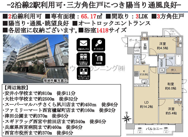 3方角部屋、、2WAYアクセス、南向き、日当たり良好。 |