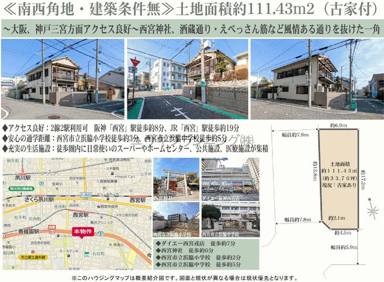 南西角地、建築条件なし、閑静な住宅街、最寄駅まで徒歩10分以内。 |