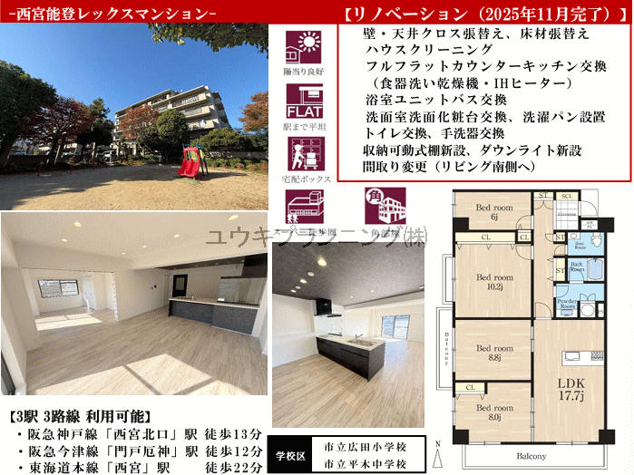 | 特色 | 【西宮能登レックスマンション】 広田小学校・平木中学校区、リフォーム済、南西角部屋、日当たり良好、総戸数50戸以上、阪急西宮北口駅徒歩13分です。 | |||||||||||||||||