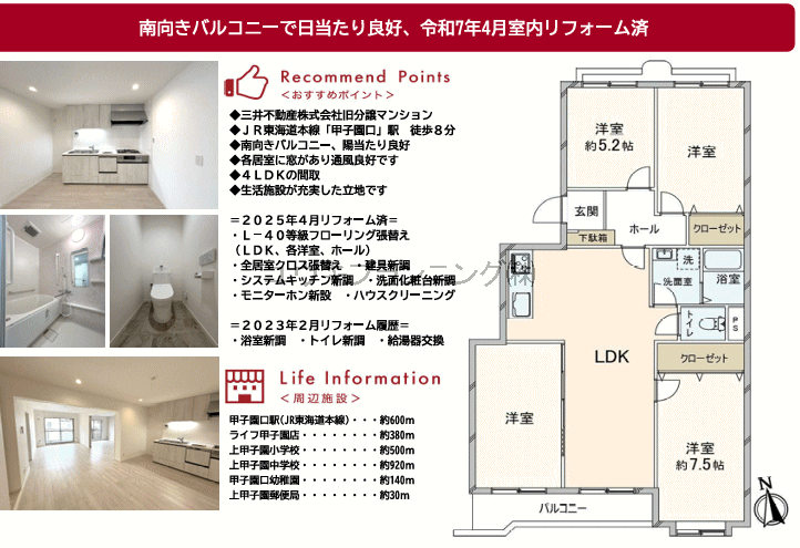 【甲子園口パークマンション】上甲子園小学校、上甲子園中学校、リフォーム済、駐車場有、日当たり良好、通風良好、閑静な住宅街、徒歩圏内にスーパー有、最寄駅まで徒歩10分以内、商店街すぐです。 |