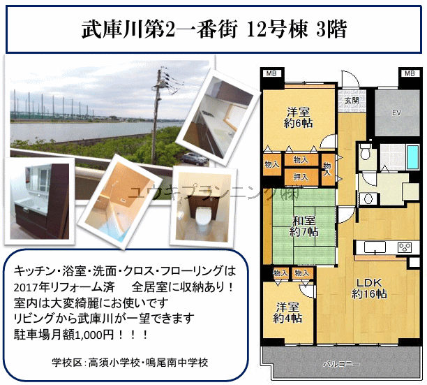 【武庫川第2一番街11号棟】高須小学校・鳴尾南中学校、エレベータ、一部リフォーム済、日当たり良好、駐車場通風良好。 |