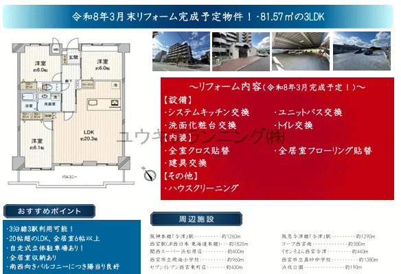 | 特色 | 【シュルマンコーポ西宮東】用海小学校、真砂中学校、3月リフォーム完成予定、駐車場有、南西向き、日当たり良好、通風良好、生活施設の充実した立地です。 | |||||||||||||||||