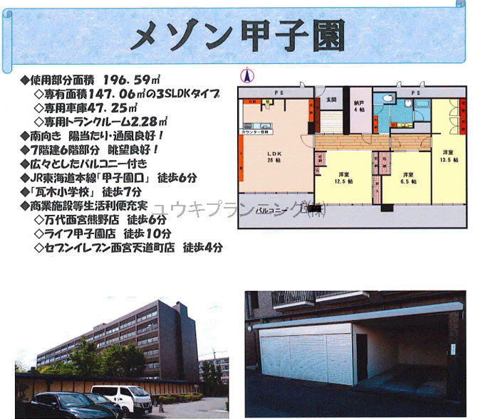 【メゾン甲子園】 瓦木小学校・深津中学校区、眺望良好、南向き、日当たり良好、駐車場有、トランクルーム付、総戸50戸以上、最寄駅まで徒歩10分以内、阪急西宮ガーデンズまで約1000m。 |