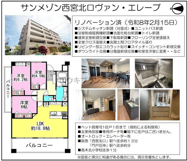 【サンメゾン西宮北口ヴァンエレーブ】高木小学校、瓦木中学校、リフォーム済、角部屋、駐車場有、ペット飼育可、床暖房有、浴室換気乾燥機能付き、日当たり良好、通風良好、閑静な住宅街、宅配ボックス。 |
