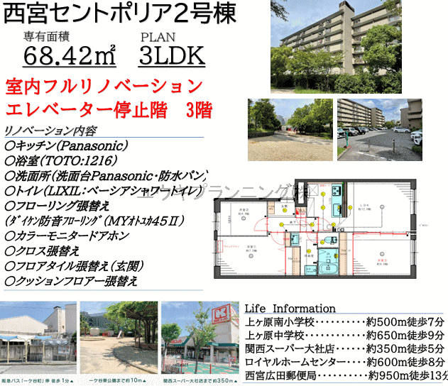 【西宮セントポリア2号棟】上ヶ原小学校、上ヶ原中学校、リフォーム済、閑静な住宅街、南向き、日当たり良好、通風良好、徒歩圏内にスーパー・ホームセンター・公園有。 |