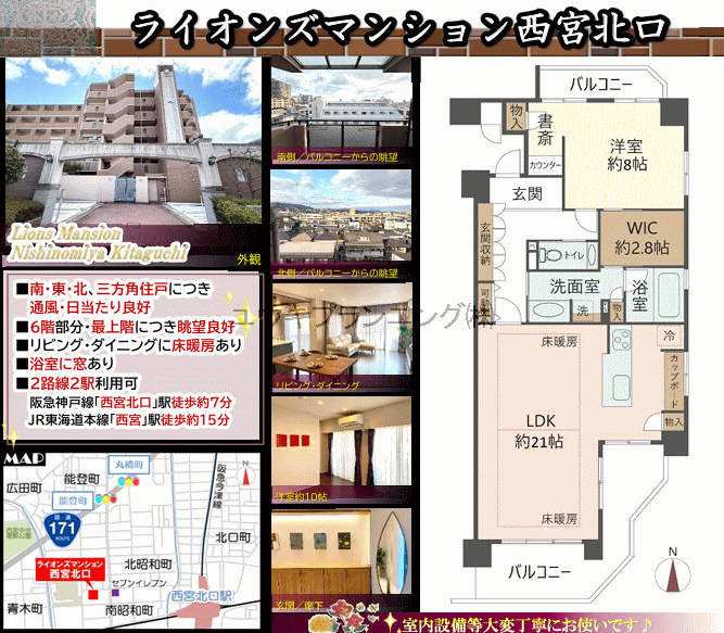 【ライオンズマンション西宮北口】平木小学校、平木中学校、3方角部屋、最上階、眺望良好、日当たり良好、通風良好、浴室窓有、駐車場有、最寄駅まで徒歩10分以内、徒歩圏内にスーパー有、床暖房有。 |