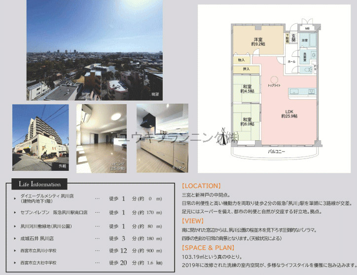 【夙川グリーンタウン南棟】夙川小学校、大社中学校、南向き、日当たり良好、眺望良好、エレベータ、阪急夙川駅前のマンション、1階にスーパー有り、生活至便です。 |
