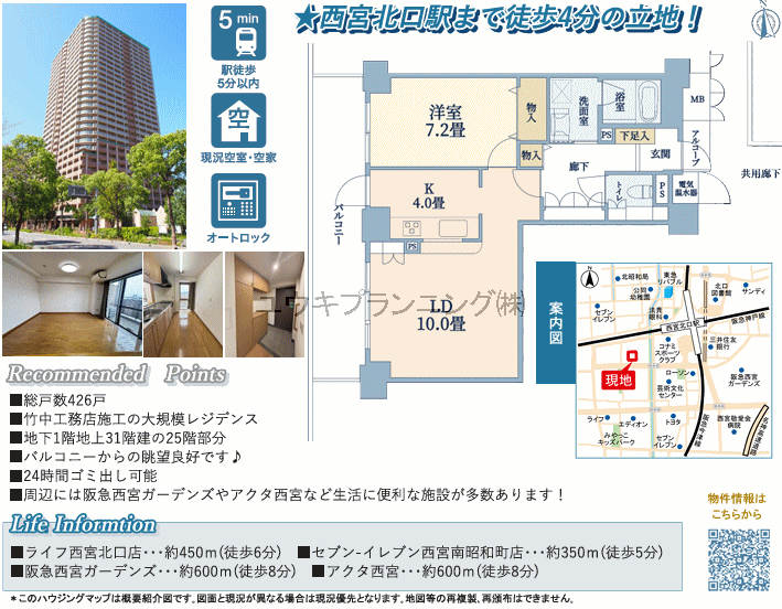 【ラピタス31西宮】平木小学校、平木中学校、眺望良好、通風良好、徒歩圏内にスーパー有、最寄駅まで徒歩10分以内、総戸数50戸以上、オール電化マンション。 |