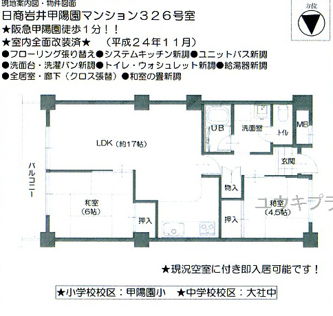 【日商岩井甲陽園マンション】 甲陽園小学校・大社中学校区、南向き、日当たり良好、駐車場有り、通風良好、駅近、徒歩圏内にコンビニ有・スーパー有り、最寄駅まで徒歩1分です。 |