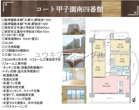 | 特色 | 【コート甲子園南4番館】今津小学校、真砂中学校、リフォーム済、3方角部屋、駐車場有、日当たり良好、オートロック、ホームセンター、コンビニ、スーパー等近隣に有生活も便利な立地です。 | |||||||||||||||||
