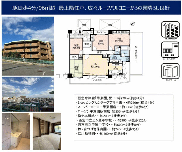 【ファミールヒルズコート上甲東園】上ヶ原小学校、甲陵中学校、最上階、眺望良好、3方角部屋、オートロック、専用ポーチ付、駐車場。 |