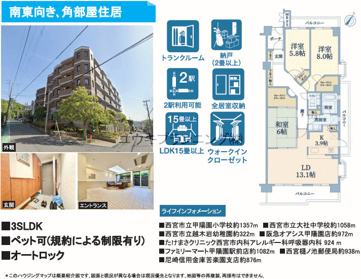 【ルネ苦楽園】 苦楽園小学校・苦楽園中学校区、オートロック、3方角部屋、駐車場有、日当たり良好、来客用駐車場あり、トランクルーム、ペット飼育可。 |