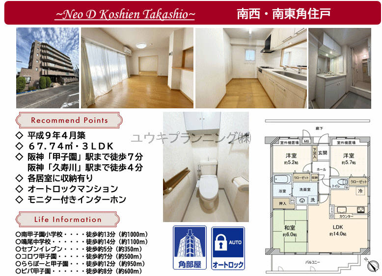 【ネオ・ディ甲子園高潮】南甲子園小学校、鳴尾中学校、駐車場有、日当たり良好、角部屋、オートロック、最寄駅まで徒歩10分以内、徒歩圏内にスーパー有。 |