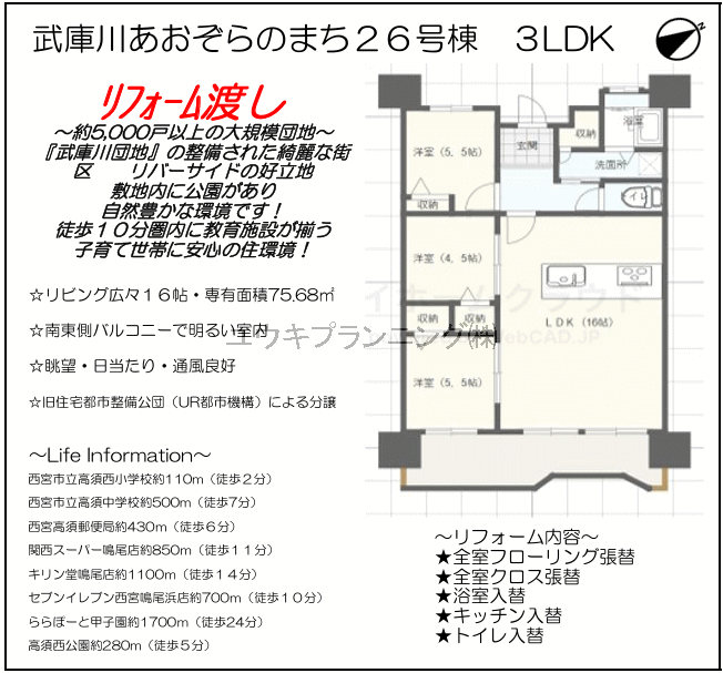 【武庫川あおぞらのまち26号棟】高須西小学校、高須中学校、リフォーム渡し、駐車場有、日当たり良好、閑静な住宅街、徒歩圏内にスーパー有。