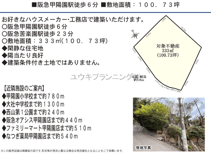【甲陽園西山町土地】甲陽園小学校、大社中学校、建築条件なし、上物有、閑静な住宅街、日当たり良好。 |