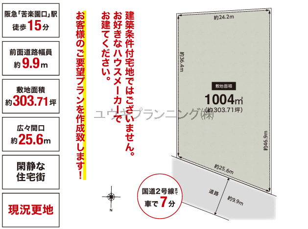 建物付、建築条件無、閑静な住宅街、整形地。