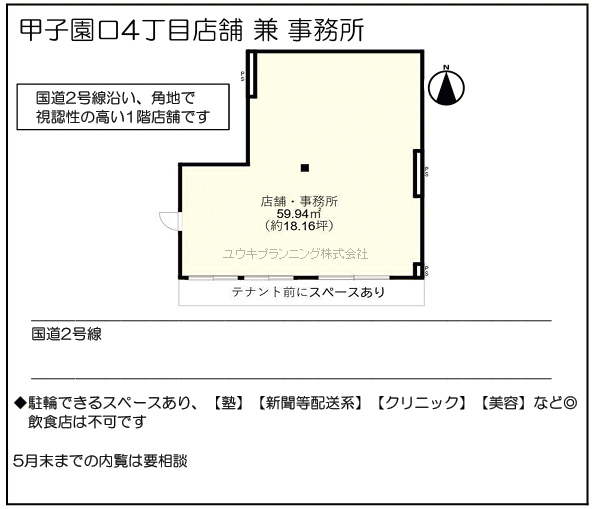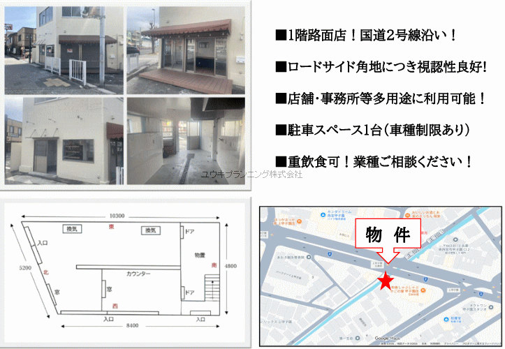 | 国道2号線に面す角地物件で大変よく目立ちます。 |