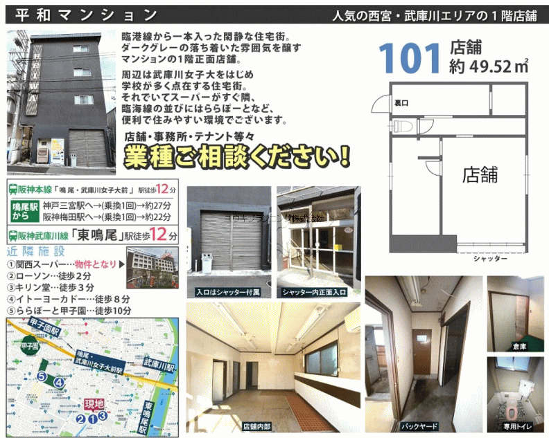 国道43号線に面す。大変よく目立つ物件です。駅徒歩2分も魅力です。 |