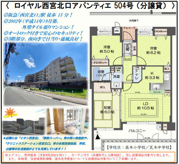 | 閑静な住宅街に建つ分譲貸マンションです。人気の高木小学校、瓦木中学校校区です。高木公園も徒歩2分たコンビニ徒歩4分ファミリーレストラン徒歩5分等々お子様の通学や奥様のお買い物も心配無しです。 |