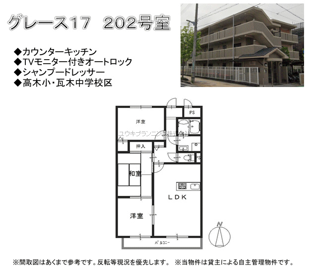 | 閑静な住宅街に建つ分譲貸マンションです。人気の高木小学校、瓦木中学校校区です。高木公園も徒歩2分たコンビニ徒歩4分ファミリーレストラン徒歩5分等々お子様の通学や奥様のお買い物も心配無しです。 |